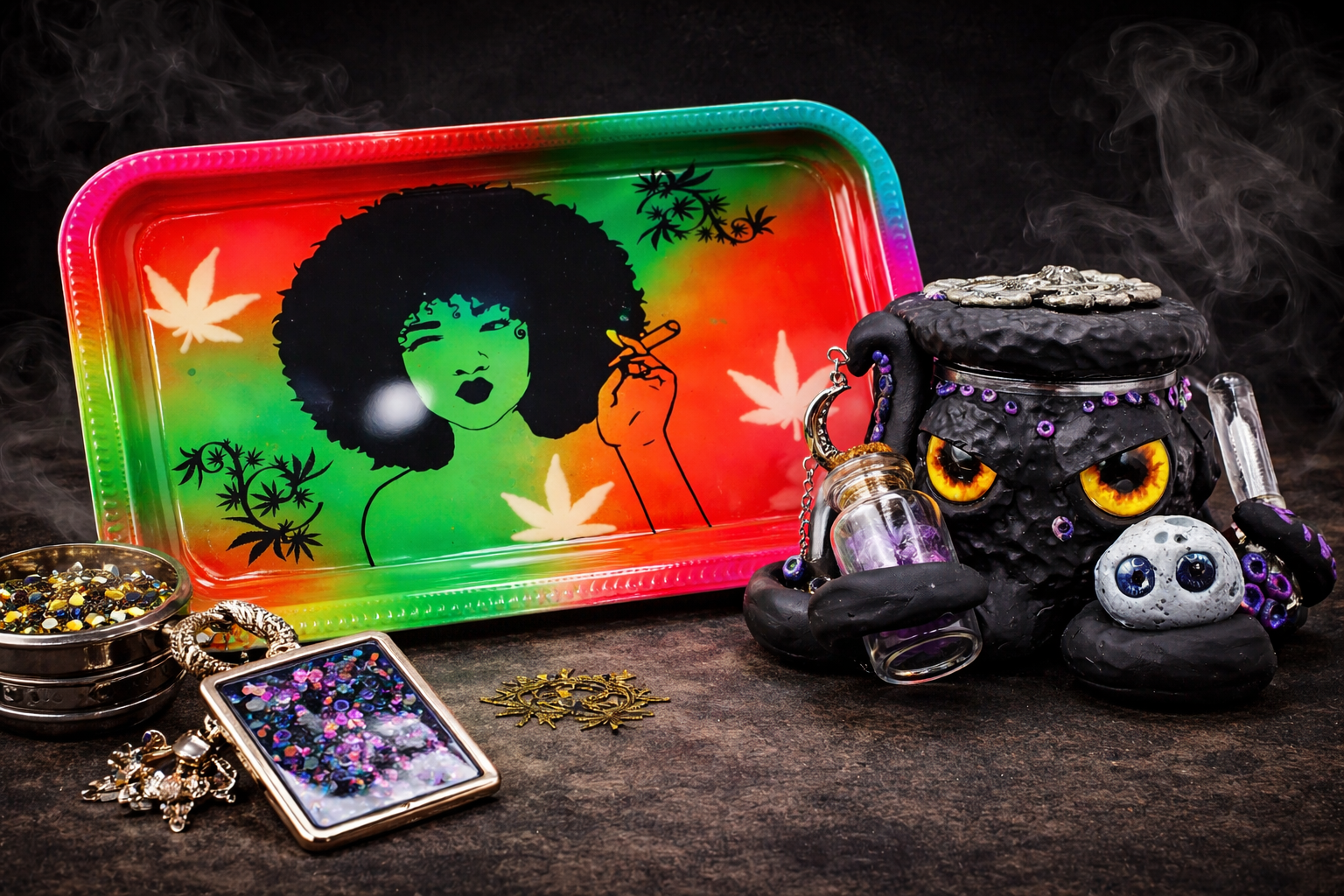 Custom rolling trays, jars, keychains, and rugs designed to bring style and personality to your smoke setup.